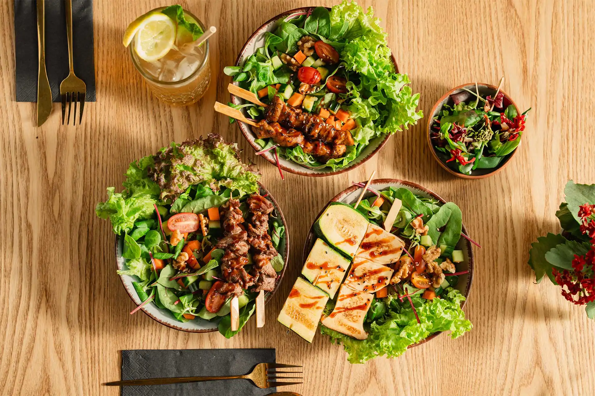 Salat mit Yakitori Spieße